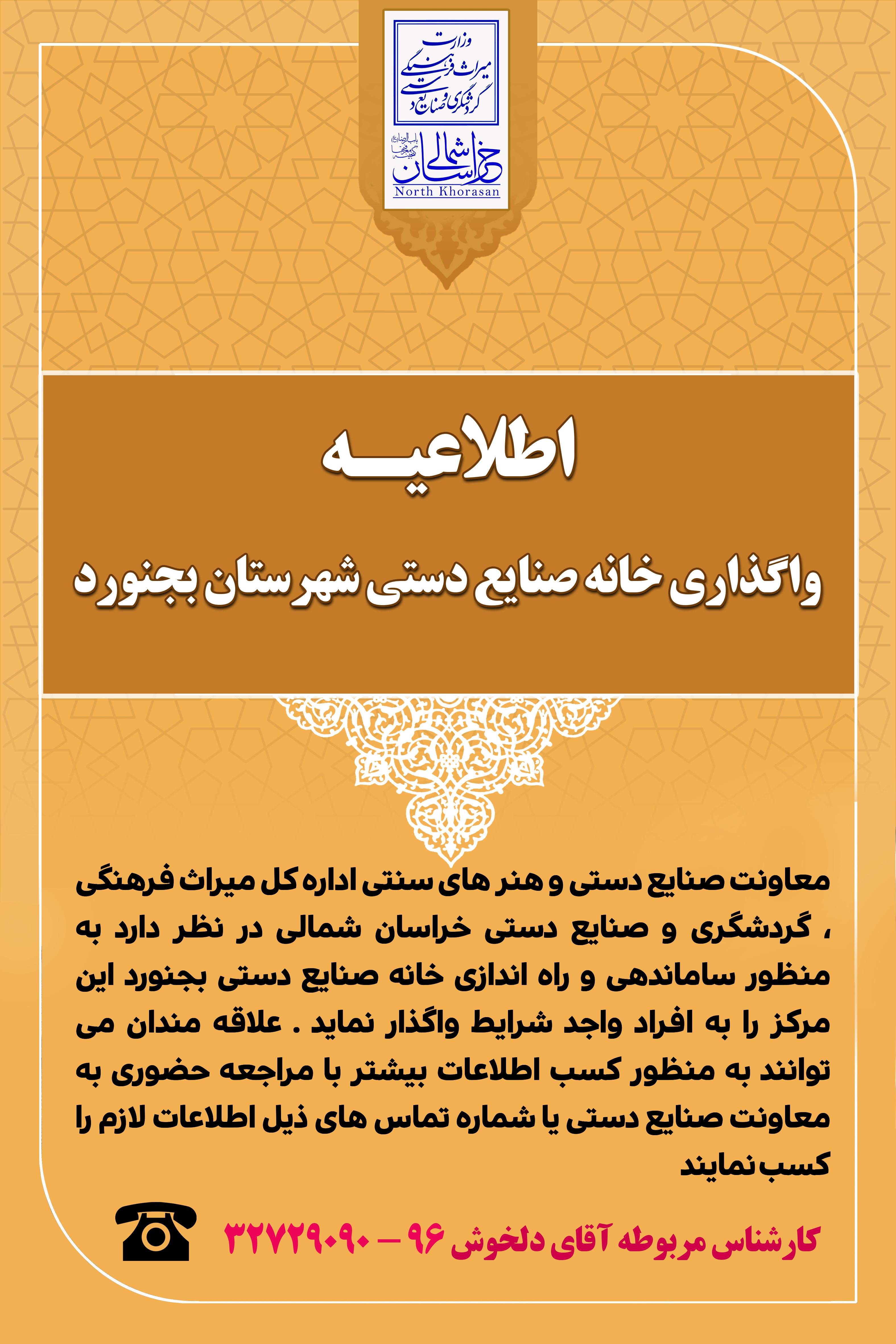 معاونت صنایع دستی و هنر های سنتی اداره کل میراث فرهنگی ، گردشگری و صنایع دستی خراسان شمالی در نظر دارد به منظور ساماندهی و راه اندازی خانه صنایع دستی بجنورد این مرکز را به افراد واجد شرایط واگذار نماید.