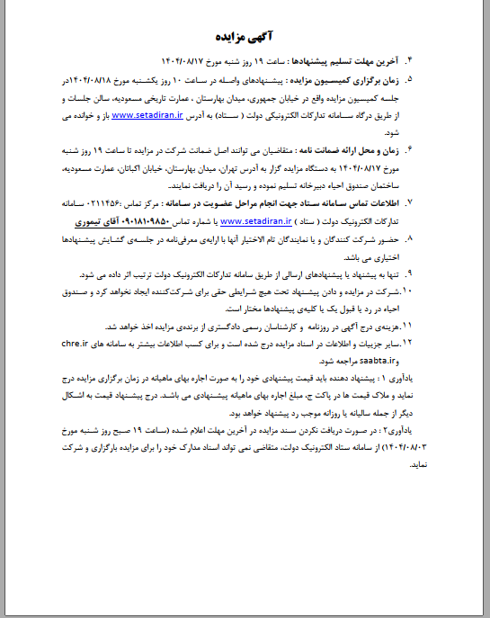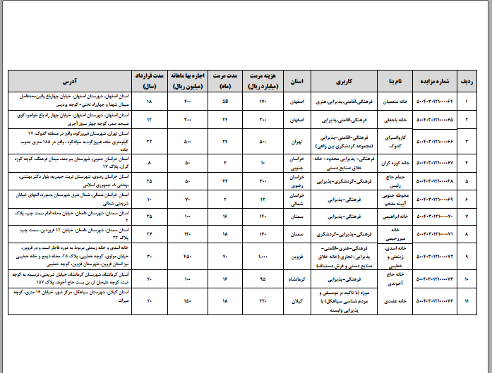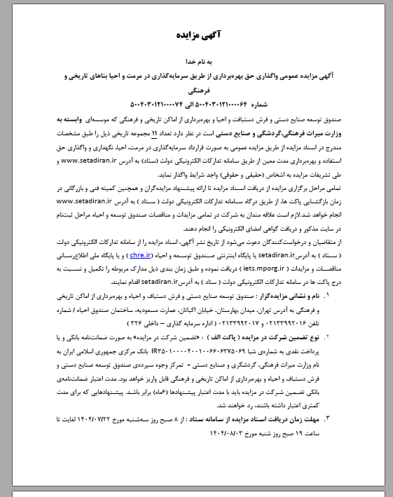 آگهی مزایده عمومی واگذاری حق بهرهبرداری از طریق سرمایهگذاری در مرمت و احیا/ آینهخانه مفخم
